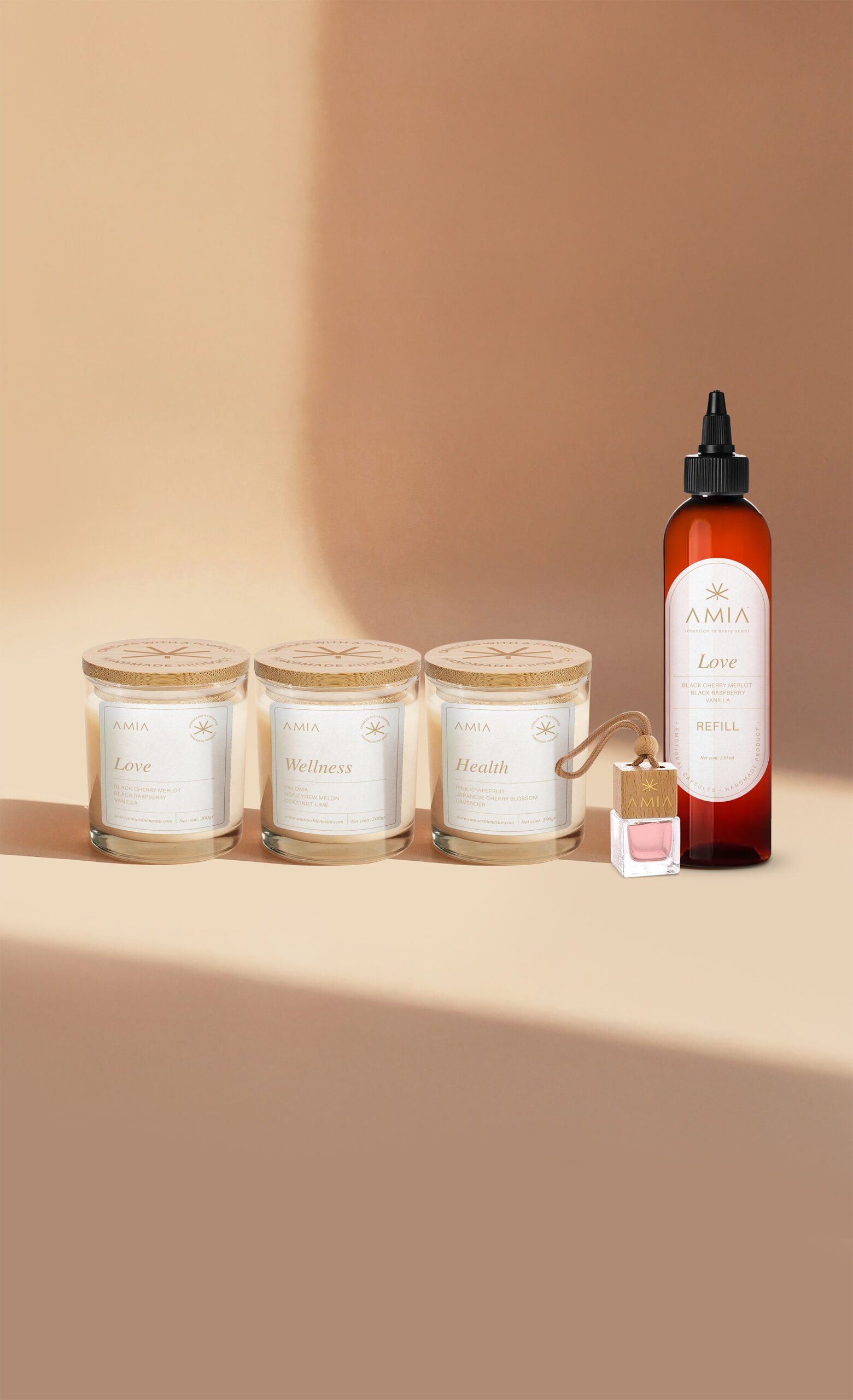 The Amia Essential Kit is an invitation to transform your spaces and your moments. It includes the three full-size Amia candles—Health, Love, and Well-being—designed to accompany you with intention, and an emotional diffuser with a 230 ml refill, ideal for subtly and harmoniously scenting any space.