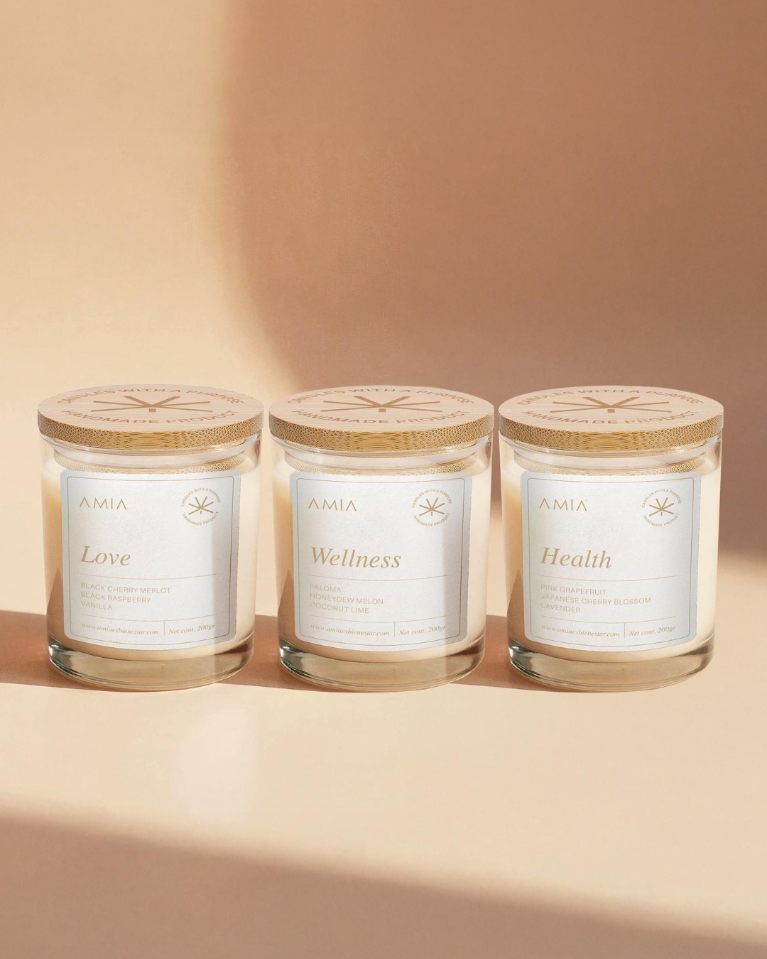 The three Amia candles—Health, Love, and Well-being—are a sensory collection designed to support you in body, mind, and heart. Each one combines unique aromas with intention, inviting you to ignite daily rituals that bring calm, presence, and connection with yourself.